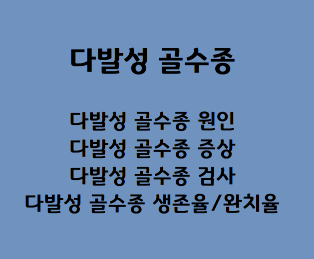 다발성 골수종의 원인과 증상, 검사방법과 기수별 생존율 및 완치에 대해 알아보도록 하겠습니다. 다발성 골수종은 골수 내에서 비정상적인 플라스마세포의 증식으로 인해 발생하는 혈액암입니다. 이 질환은 골수에서 여러 부위로 퍼져있는 비정상적인 플라스마세포들에 의해 특정 단백질인 모노클로날 감마 글로불린(M protein)이 생산되는 것으로 특징짓습니다.