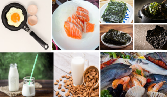 갑상선 호르몬의 핵심 구성 성분은 요오드이므로, 갑상선 기능 저하증 환자는 요오드 함유 식품을 섭취하는 것이 중요합니다. 예를 들어, 어패류(조개, 게, 해산물, 멸치), 해조류(김, 다시마, 미역), 유제품(우유 및 요구르트, 아이스크림 등)과 같은 식품이 요오드 함량이 높습니다. 그러나, 갑상선 자극 호르몬(TSH) 수치가 높은 경우에는 과다한 요오드 섭취는 피해야 할 수 있습니다. - 비타민 D