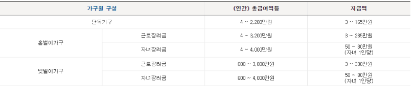 가구 구성원에 따라 연간 부부합산 총소득금액에 기준이 있습니다. 해당 기준금액 미만이여야 하며, 총급여액에 따라 장려금이 정해집니다.