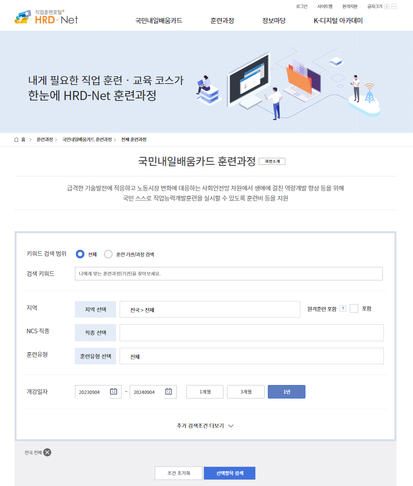 내일배움카드의 사용처는 상단의 바로가기를 통해 확인이 가능합니다. 혹은 HRD-Net 홈페이지의 상단 훈련과정 탭을 통해서 지역별로 사용처를 알 수 있습니다. 원하는 지역의 직종, 훈련을 선택해서 개인에게 최적화된 훈련들을 확인하고 신청하실 수 있습니다.