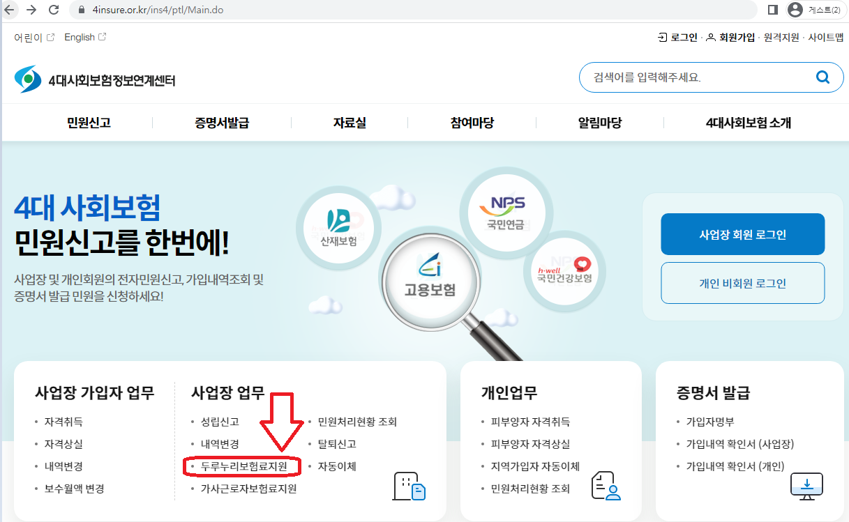 두루누리 지원금 신청 방법은 온라인으로 신청하는 방법과 직접 방문해서 신청하는 방법이 있습니다. 먼저 온라인으로 신청하는 방법입니다. 4대 사회보험 정보연계센터 홈페이지로 접속해서 아래 그림과 같이 두루누리 보험료 지원을 클릭해서 신청하실 수 있습니다.