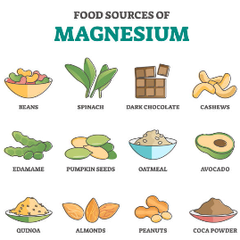 마그네슘은 견과류(아몬드, 호두, 호박씨, 참깨), 녹색 채소(시금치, 케일, 근대), 통곡물(현미, 퀴노아, 귀리) 등에 많이 포함되어 있으며, 필요시 영양제로 보충하는 것도 권장됩니다.