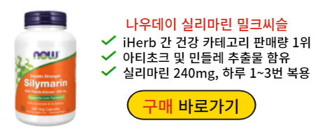 나우푸드 실리마린 밀크씨슬 제품은 간에 좋다고 알려진 민들레 추출물과 아티초크도 같이 포함되어 있습니다. 아이허브 간 건강 카테고리에서 1위의 판매량을 가지고 있을 만큼 인기가 좋고, 높은 가성비를 자랑하고 있습니다. 실리마린은 240mg 함유되어 있습니다.
