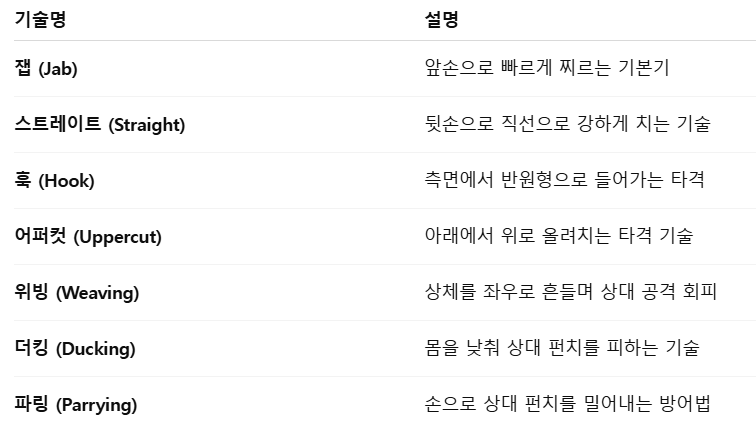 상대 펀치를 쳐내는 파링이 대표적입니다.➡️ 복싱은 단순히 때리는 운동이 아니라