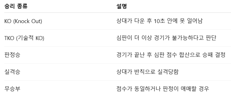 상대 선수가 고의적 반칙을 반복하거나 규정을 어기면 실격승도 가능합니다.➡️ KO와 TKO는 가장 극적인 승리 방식이며,