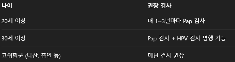 👉 Pap 검사 + HPV 검사를 병행하면 암 전단계부터 조기 발견률이 매우 높습니다.