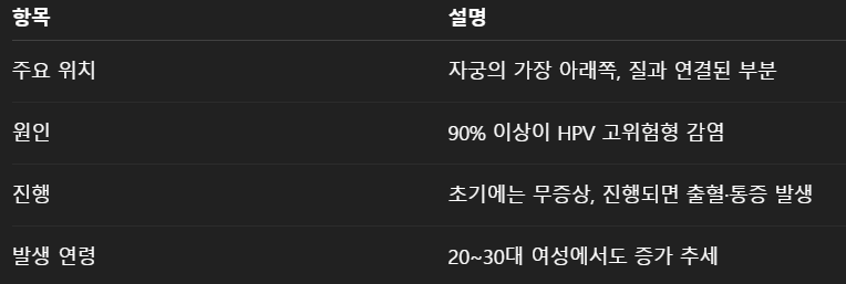 - 자궁경부암의 원인은 대부분 **HPV(사람유두종바이러스)**이며,
