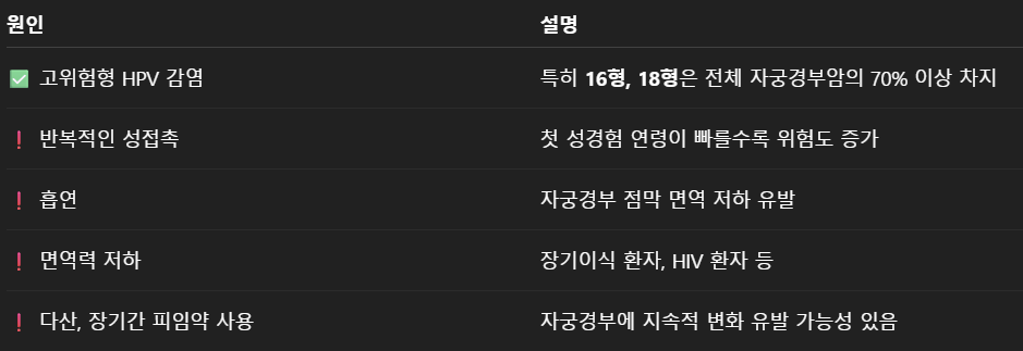 - 자궁경부암의 원인은 대부분 **HPV(사람유두종바이러스)**이며,