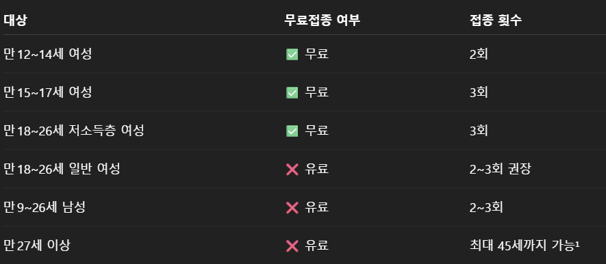 - 일부 남성도 접종 가능 (특히 HPV 사마귀 예방 목적)