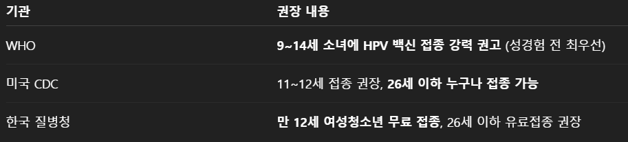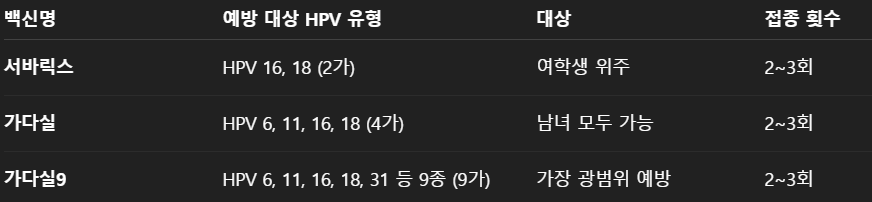 예방접종 백신 종류 👉 HPV 백신은 성 경험 이전 접종 시 가장 효과적입니다.