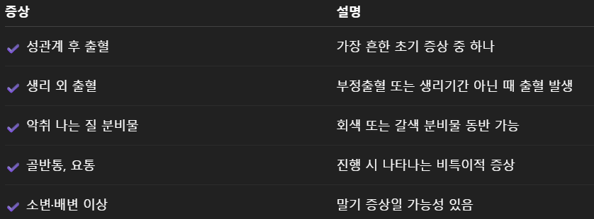 자궁경부암 증상 👉 초기에는 전혀 증상이 없기 때문에 정기검진이 필수입니다.