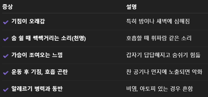 ➡️ 기침이 3주 이상 지속되고, 밤에 심해지며, 숨이 차거나 쎽쎽거리는 소리가 나면 천식을 의심해야 합니다.