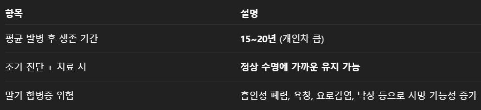 👉 적절한 약물치료와 물리치료 병행 시, 장기간 양질의 삶 유지도 가능합니다.