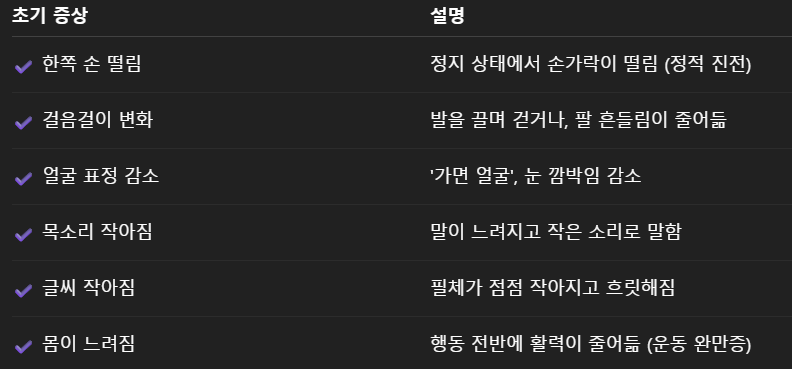 👉 특히 한쪽 증상부터 시작되면 파킨슨병 가능성이 높습니다.