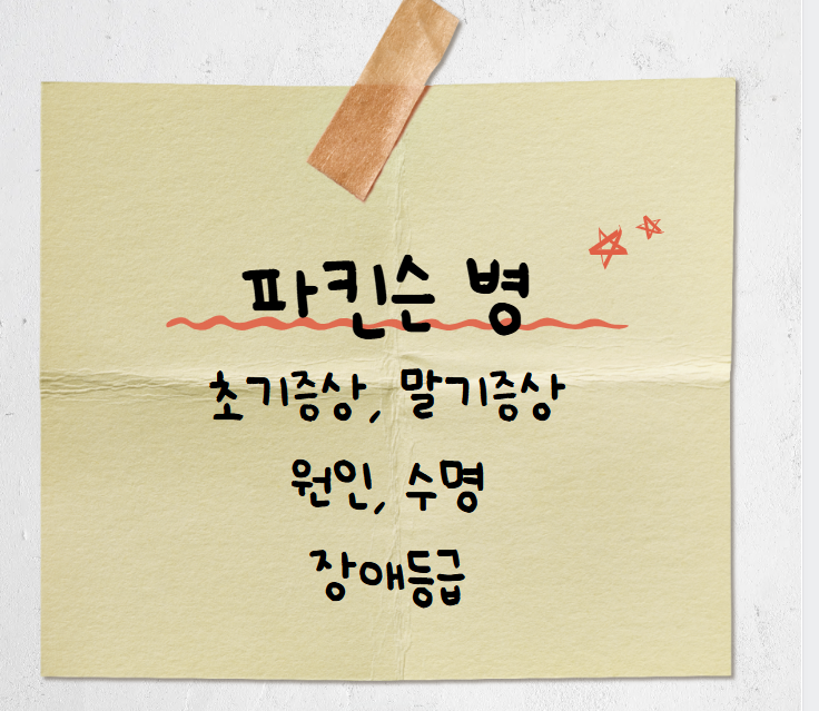중추신경계의 퇴행성 질환으로, 적절히 조기 진단하고 꾸준히 관리해야 삶의 질과 수명을 지킬 수 있는 병입니다.이 글에서는 파킨슨병의 초기증상, 말기증상, 원인, 예후, 수명, 장애등급 기준까지 핵심 정보만 정리했습니다.