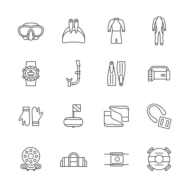 물 속에서 눈을 보호하고 시야를 확보하기 위해 사용됩니다. 적절한 크기와 피팅이 중요하며, 안정적이고 누수 없는 마스크를 선택해야 합니다. - 슈트(Wetsuit 또는 Drysuit)
