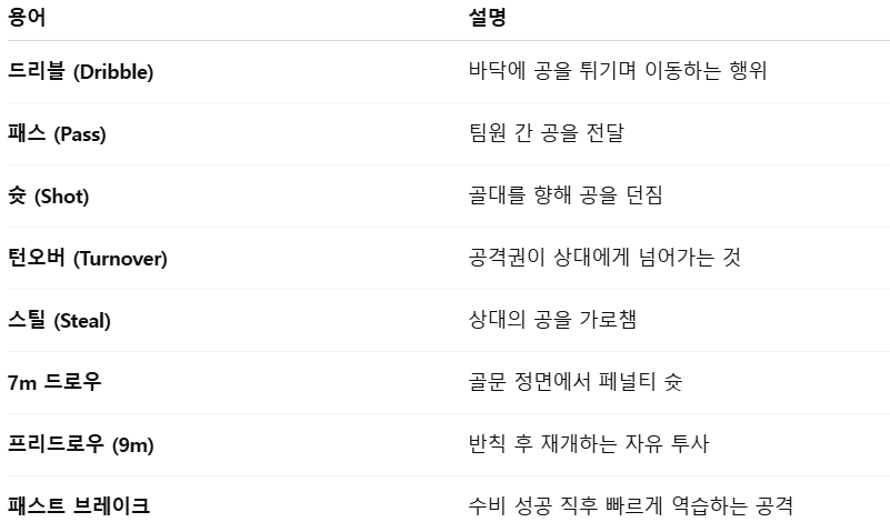 👉 7m 드로우는 축구의 페널티킥과 유사한 개념입니다.📘 핸드볼 주요 용어 정리