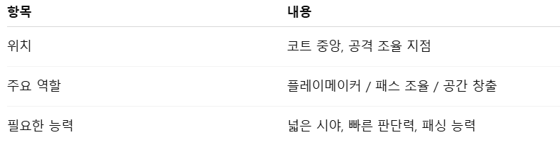 전술을 조직하고 공격의 방향을 결정하며, 상대 수비를 흔드는 브레인 포지션이죠.