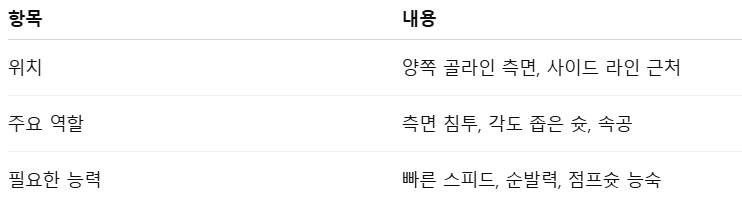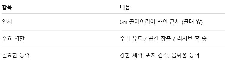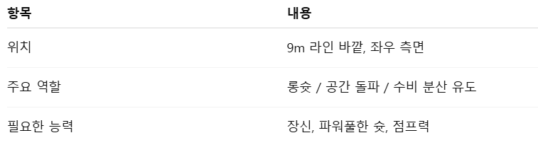 7m 드로우(페널티슛)를 막거나 연속 세이브로 경기 흐름을 바꾸는 메멘텀의 핵심 역할을 합니다.📊 포지션별 간단 비교 요약표